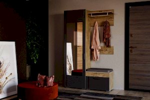 Выдвижная штанга предназначена для размещения одежды на вешалках-плечиках и помогает быстро найти нужную вещь. В шкафу также находятся и две широкие полки. Антресольная полка лучше всего подходит для хранения сезонной одежды, а нижняя – для размещения коробок с обувью.