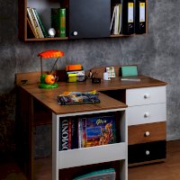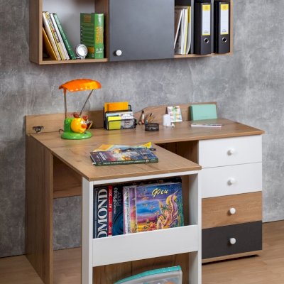 Угловой вариант рабочего места для школьника – эргономичное решение в организации рабочего пространства. Увеличить площадь рабочего места можно используя дополнительную консоль к письменному столу школьника. Ее можно установить с любой стороны письменного стола в зависимости от планировки детской комнаты. Дополнительный двухъярусный карман – место для хранения книг, рабочих тетрадей и папок. Ширину стола можно увеличить или уменьшить на 150 мм с шагом в 1 мм.