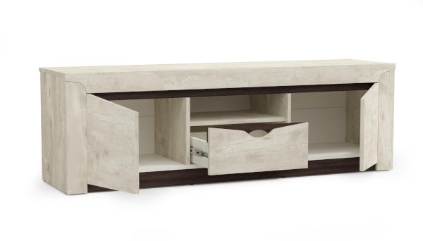 Поскольку основной функционал тумбы – это все-таки подставка под ТВ, то она не такая вместительная, как остальные модули. Но в принципе – совсем и не маленькая. Внешне она разделена на 4 части. По центру открытая полка-ниша, в которую можно поставить приставку, элементы домашнего кинотеатра, музыкальный проигрыватель – технику, которая должна быть в открытом доступе. Под нишей находится выдвижная полка. А по бокам – за распашными дверцами – два вместительных отсека.