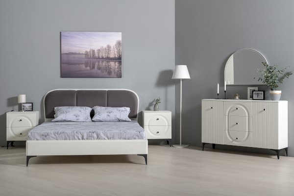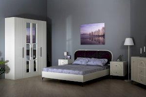 Кровать установлена на высокие ножки, что делает конструкцию лёгкой и воздушной, изголовье кровати декорировано пышным мягким элементом. Матрас укладывается на ортопедическое основание с гнутоклееными ламелями.
